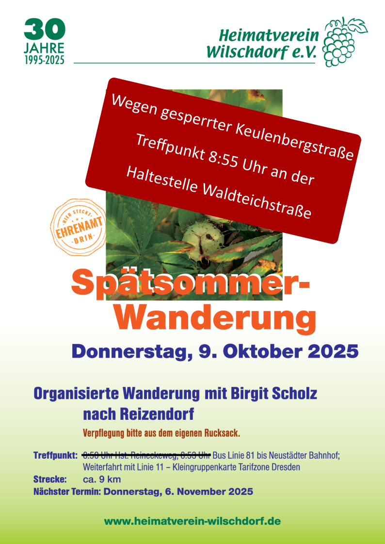 Zum Löbauer Berg – Strecke ca. 8 km Do.06.11.2025 Treffpunkt: 8:50 Uhr Haltestelle Reineckeweg 8:53 Uhr Buslinie 81 bis Neustädter Bahnhof Weiterfahrt mit dem RE 1 Fahrkarte: Deutschland- oder Sachsenticket (1-5 Personen) Verpflegung – aus dem eigenen Rucksack, evtl.Berggasthof Honigbrunnen