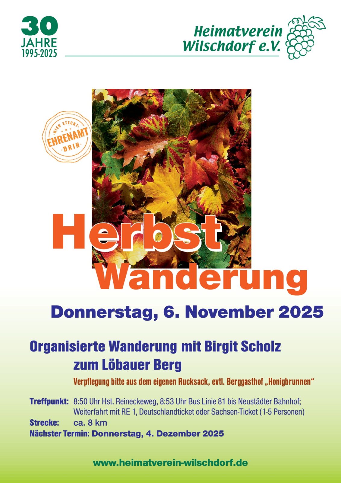 Zum Löbauer Berg – Strecke ca. 8 km Do.06.11.2025 Treffpunkt: 8:50 Uhr Haltestelle Reineckeweg 8:53 Uhr Buslinie 81 bis Neustädter Bahnhof Weiterfahrt mit dem RE 1 Fahrkarte: Deutschland- oder Sachsenticket (1-5 Personen) Verpflegung – aus dem eigenen Rucksack, evtl.Berggasthof Honigbrunnen